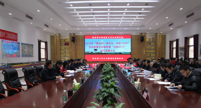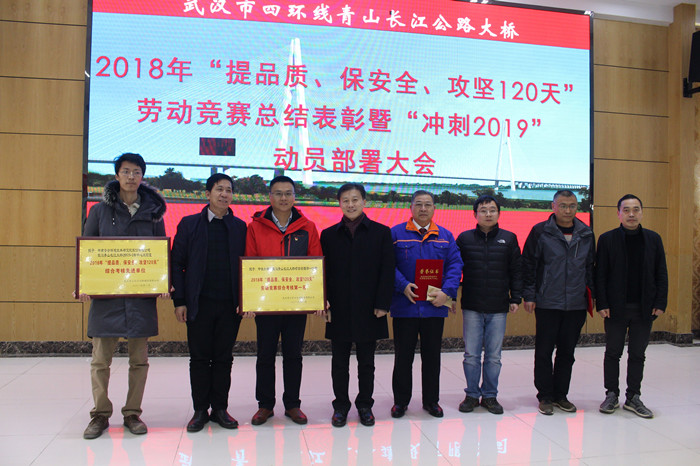 2019年1月18日下午,青山橋公司在天興洲會議室隆重召開2018年“提品質、保安全、攻堅120天”勞動競賽總結表彰暨“沖刺2019”工作動員部署大會。武漢交投集團總經理、青山橋公司董事長陳順平,大橋局副局長張春新及各參建單位領導出席會議。