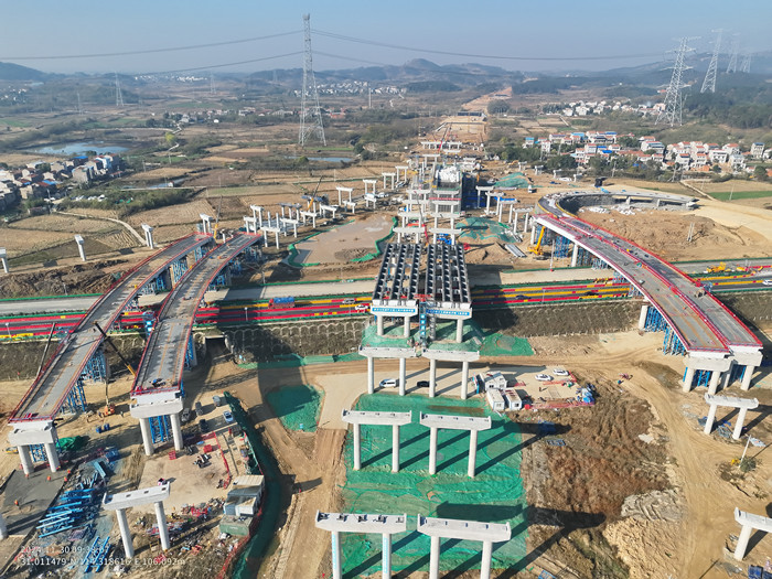 研子崗樞紐互通跨武漢至大悟高速公路6聯(lián)鋼箱梁總用鋼量約4350t,各聯(lián)均采用支架吊裝法施工。主線橋?yàn)閱慰绾喼т摶旖M合梁,跨徑62m,左右兩幅對稱布置,總寬34m,用鋼量785t;匝道橋共4聯(lián),各匝道均為組合跨徑(40+60+40)m連續(xù)鋼箱梁。該處鋼箱梁跨越雙向六車道的武大高速,涉路施工手續(xù)辦理復(fù)雜,協(xié)調(diào)難度大,跨徑大,施工安全風(fēng)險大,現(xiàn)場吊裝焊接質(zhì)量管控難度大,項(xiàng)目公司組織參建單位提前部署、優(yōu)化方案、多級聯(lián)動,截至11月29日,研子崗樞紐互通跨武漢至大悟高速公路6聯(lián)鋼箱梁安全順利完成吊裝。