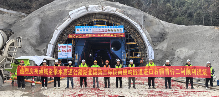 南樓嶺隧道(湖北段)為武漢交投集團(tuán)投資建設(shè)的首條隧道,通修高速止于兩省交界的南樓嶺處,通過隧道方式與江西段對接,南樓嶺隧道全長2743.6m,其中湖北境隧道長1425.6m。為確保南嶺樓隧道首件二襯的順利澆筑,項(xiàng)目公司多措并舉,扎實(shí)做好澆筑準(zhǔn)備工作,根據(jù)隧道地質(zhì)、施工條件及混凝土特性,集結(jié)技術(shù)專家開展深入研討,精心編制首件二襯混凝土澆筑專項(xiàng)方案:對原材料選型、配合比調(diào)試反復(fù)推敲;采用先進(jìn)智能二襯鋼模臺車,確;炷翝仓木鶆蛐、密實(shí)性,大大提高施工效率和質(zhì)量;對施工準(zhǔn)備、防水卷材鋪設(shè)、排水管道安裝、鋼筋安裝、二襯臺車定位、模板加固、混凝土澆筑等工藝流程按要求嚴(yán)格把關(guān);澆筑過程中,安排專人全過程旁站,嚴(yán)格把控施工工序,確保各施工環(huán)節(jié)緊密銜接;嚴(yán)格按照規(guī)范圖紙要求驗(yàn)收,確保襯砌施工全過程的安全質(zhì)量可控;嚴(yán)格落實(shí)首件工程制,為后續(xù)施工提供寶貴的經(jīng)驗(yàn)和參考價值。