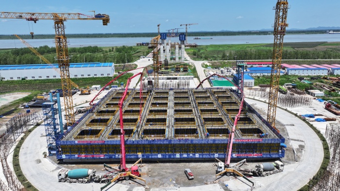 作為大橋的“定海神針”,錨碇承擔(dān)著拉住主纜的關(guān)鍵作用。漢南長(zhǎng)江大橋的錨碇沉井規(guī)模巨大,其基礎(chǔ)平面尺寸達(dá)76.4米×76.4米,面積約5837平方米,相當(dāng)于14個(gè)標(biāo)準(zhǔn)籃球場(chǎng)大小,被譽(yù)為公路工程世界第一大沉井。沉井總高43米,將分8節(jié)澆筑成型。此次南岸沉井完成了第五節(jié)(高度4.5米)的混凝土澆筑,澆筑量約7650立方米。