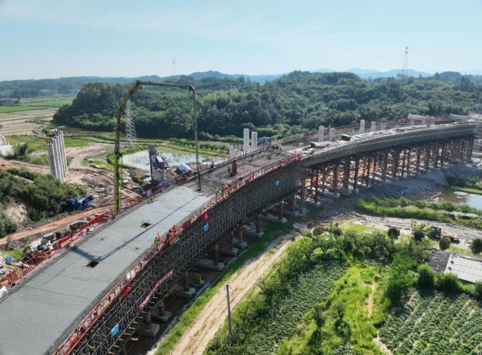 7月3日,通城至修水高速公路(湖北段)項(xiàng)目沙坪北互通D匝道首聯(lián)現(xiàn)澆梁順利完成澆筑,設(shè)計(jì)為單箱單室預(yù)應(yīng)力混凝土現(xiàn)澆箱梁,現(xiàn)澆箱梁長100米,梁高1.6米,橋面寬度9米,這標(biāo)志著項(xiàng)目上部結(jié)構(gòu)施工取得重大進(jìn)展,為項(xiàng)目后續(xù)建設(shè)按下了“快進(jìn)鍵”。