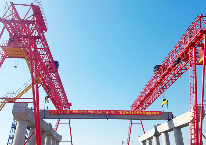 負責本次箱梁架設任務的是HNTJ-7標段,施工線路全長約11.845公里,橋梁占比100%,共設計預制箱梁5135片,全部由項目智慧梁場預制。項目全線首個智慧梁場占地約210畝,場內(nèi)設置10條智能生產(chǎn)線,配備40個移動臺座、達產(chǎn)后可以達到“日產(chǎn)8片梁”高效運轉(zhuǎn)的目標。本次箱梁的成功架設,為全線大干快上奠定了堅實基礎,助推項目建設跑出“加速度”。