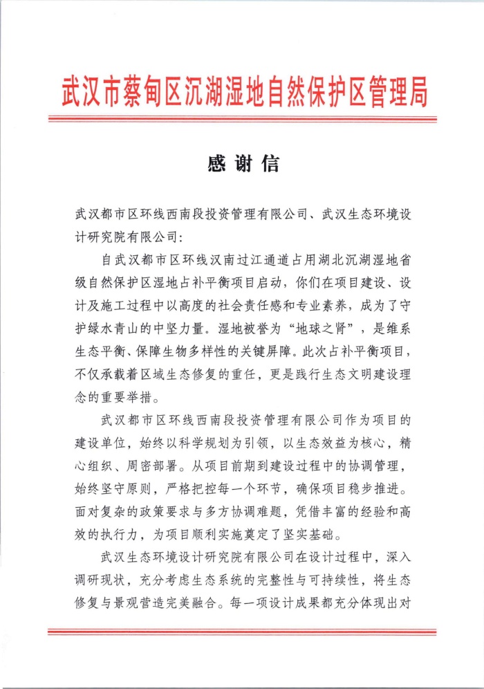 初夏六月,荷尖初露,武漢都市圈環(huán)線高速公路漢南長江大橋及接線工程沉湖濕地保護(hù)區(qū)內(nèi)蛙鳴漸起、蒲草搖曳,處處涌動(dòng)著蓬勃生長的活力。在這萬物競發(fā)的美好時(shí)節(jié),項(xiàng)目團(tuán)隊(duì)收到了來自蔡甸區(qū)沉湖濕地自然保護(hù)區(qū)管理局的感謝信。信中特別指出,項(xiàng)目團(tuán)隊(duì)以科學(xué)的生態(tài)修復(fù)方案和高效的執(zhí)行能力,在重大交通基礎(chǔ)設(shè)施建設(shè)與濕地生態(tài)保護(hù)間找到了平衡點(diǎn),繪就了建設(shè)發(fā)展與生態(tài)保護(hù)同頻共振的和諧圖景,為同類項(xiàng)目樹立了標(biāo)桿。這也標(biāo)志著該項(xiàng)目濕地“占補(bǔ)平衡”工作圓滿收官,在兼顧生態(tài)效益與工程可行性具體實(shí)踐路徑上又探索出了新路徑。