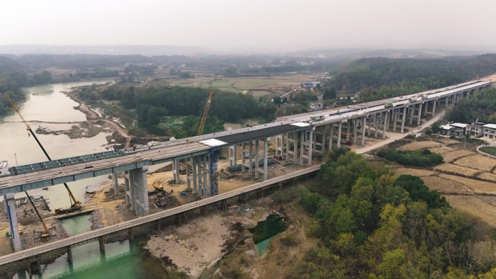 作為項(xiàng)目年度攻堅(jiān)的“主戰(zhàn)場(chǎng)”,此次告捷的雙線節(jié)點(diǎn)均面臨“高難度、高風(fēng)險(xiǎn)、高強(qiáng)度”的嚴(yán)峻考驗(yàn)。其中,全長(zhǎng)1022米的雋水河特大橋更是全線建設(shè)的“硬骨頭”。大橋左幅第九聯(lián)、右幅第十聯(lián)采用鋼箱梁結(jié)構(gòu),單幅重達(dá)900噸、總長(zhǎng)110米,需凌空跨越車(chē)流密集的G56杭瑞高速,施工精度要求極高,交通組織壓力巨大。而大橋第四聯(lián)、第五聯(lián)采用的鋼混組合梁,最大跨徑50米,上跨雋水河,作業(yè)面窄、吊裝難度大、安全風(fēng)險(xiǎn)高,被列為項(xiàng)目年度重難點(diǎn)攻堅(jiān)任務(wù)之首。