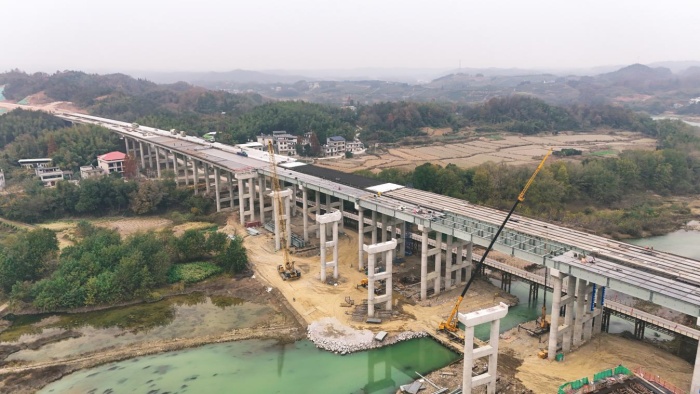 歲末攻堅(jiān)傳捷報(bào),決勝全年戰(zhàn)正酣。近日,由武漢城發(fā)集團(tuán)所屬交投集團(tuán)投資建設(shè)的通城至修水高速公路(湖北段)項(xiàng)目,迎來(lái)重大建設(shè)突破——隨著雋水河特大橋左幅第九聯(lián)鋼箱梁精準(zhǔn)落位、右幅第五聯(lián)鋼混組合梁最后一榀主梁平穩(wěn)吊裝完成,項(xiàng)目全線鋼箱梁頂推與鋼混組合梁安裝任務(wù)圓滿(mǎn)完成。這一關(guān)鍵節(jié)點(diǎn)的攻克,不僅為后續(xù)橋面系施工掃清了核心障礙,也為實(shí)現(xiàn)“決勝全年紅”目標(biāo)注入了強(qiáng)勁動(dòng)力。
